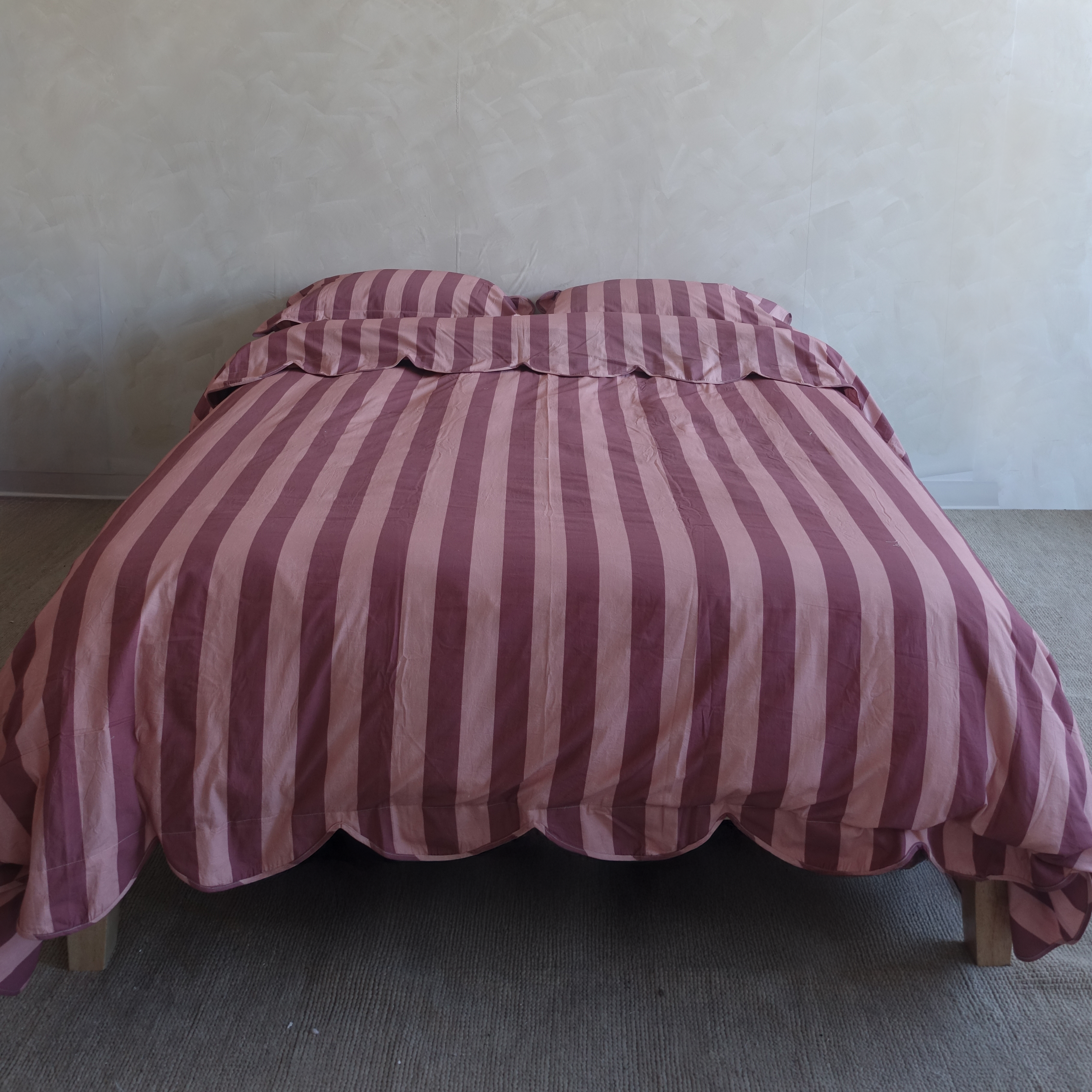 A scalloped, 100% organic cotton duvet set (with two matching shams), designed with hidden buttons, internal ties, and hypoallergenic OEKO-TEX® certified fabric for a breathable, hotel-level sleep.