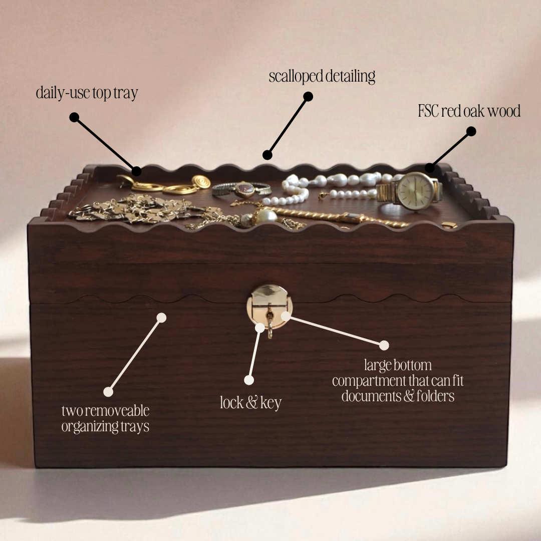 This (patented!) 2-in-1 keepsake box serves as a removable daily-use tray and thoughtful storage for your most sentimental items and documents.