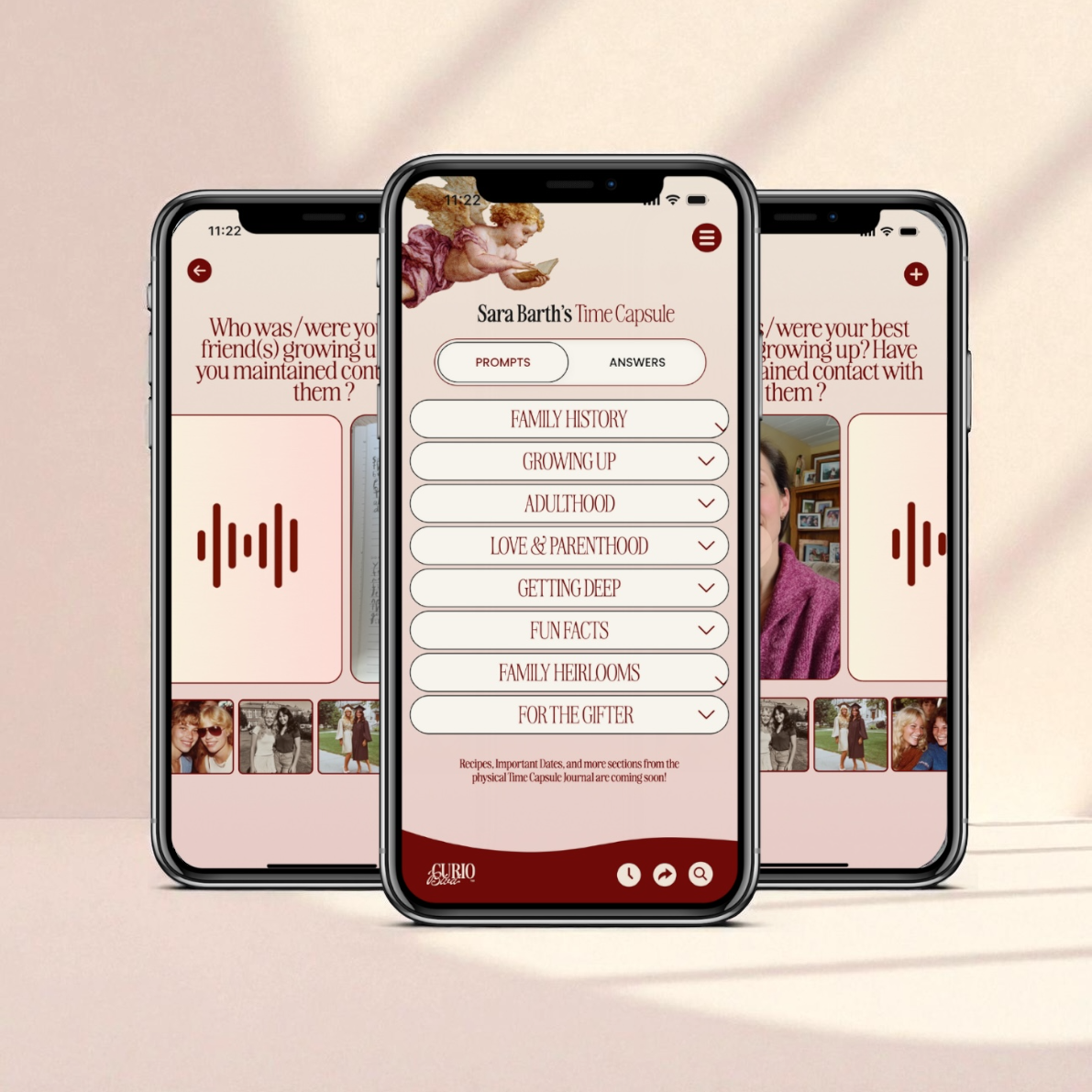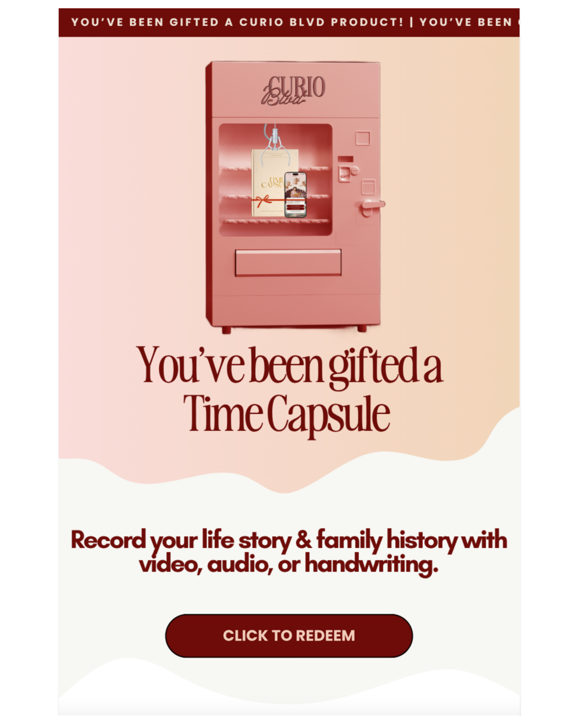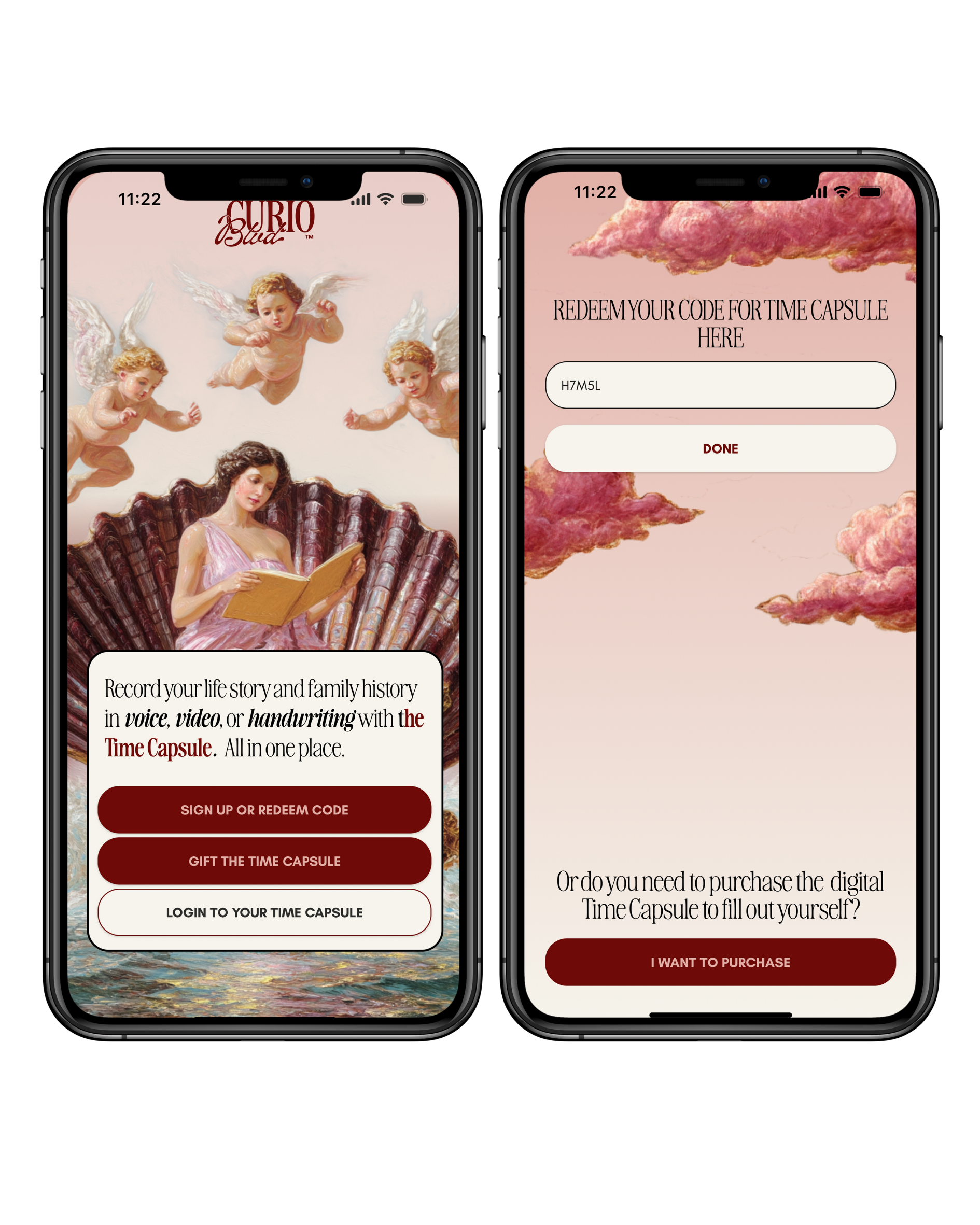Once they have completed redemption, they’ll be emailed the Curio Blvd app download link along with a unique code. Once the app is installed and the code is entered, their Time Capsule opens immediately, and they can begin recording their life story and family history.